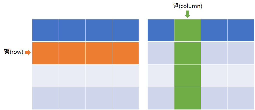 | 열 | 1. 특성(feature) 2. 속성(attribute) 3. 변수(variable) 4. field |
