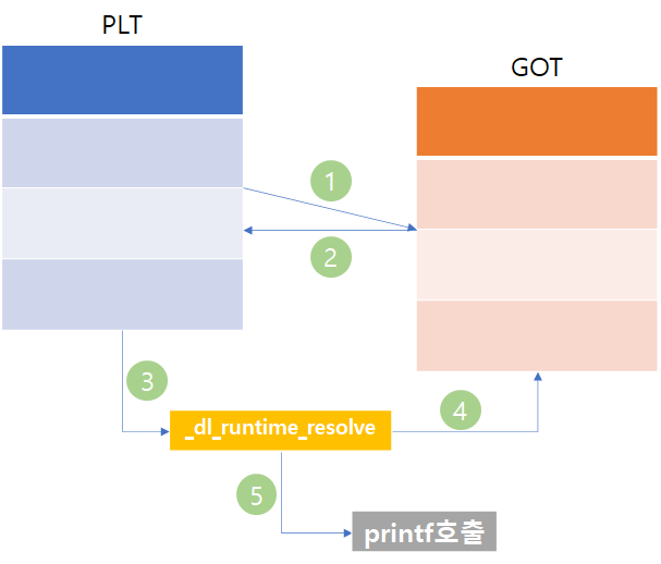 => [printf호출] -> [plt이동] -> [got참조] -> [plt이동] -> [_dl_runtime_resolve수행] -> [got에 실제 주소 저장] -> [실제 함수 주소로 분기]